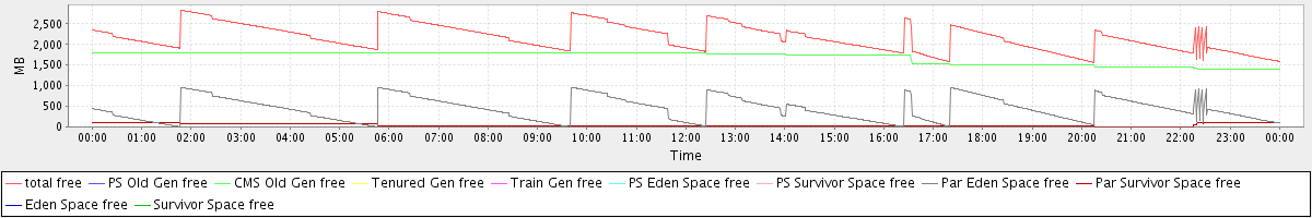 avg(total free) = 2171.18 avg(PS Old Gen free) = 0.00 avg(CMS Old Gen free) = 1690.46 avg(Tenured Gen free) = 0.00 avg(Train Gen free) = 0.00 avg(PS Eden Space free) = 0.00 avg(PS Survivor Space free) = 0.00 avg(Par Eden Space free) = 436.69 avg(Par Survivor Space free) = 44.02 avg(Eden Space free) = 0.00 avg(Survivor Space free) = 0.00