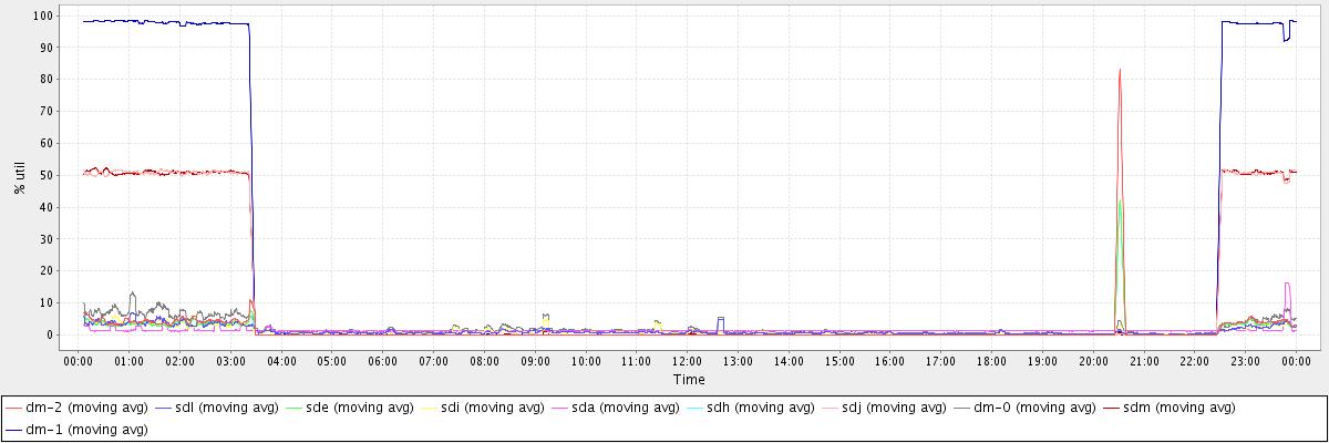 avg(dm-2) = 1.30 avg(sdl) = 1.14 avg(sde) = 0.95 avg(sdi) = 1.11 avg(sda) = 1.39 avg(sdh) = 0.93 avg(sdj) = 10.46 avg(dm-0) = 2.13 avg(sdm) = 10.47 avg(dm-1) = 20.13