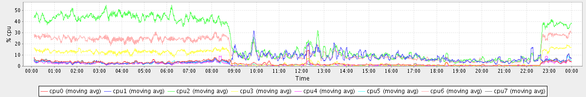 avg(cpu0) = 23.86 avg(cpu1) = 11.24 avg(cpu2) = 12.31 avg(cpu3) = 10.28 avg(cpu4) = 8.74 avg(cpu5) = 9.73 avg(cpu6) = 10.69 avg(cpu7) = 10.26
