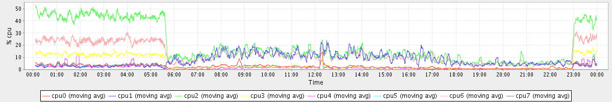 avg(cpu0) = 2.57 avg(cpu1) = 7.74 avg(cpu2) = 20.05 avg(cpu3) = 4.57 avg(cpu4) = 1.53 avg(cpu5) = 1.73 avg(cpu6) = 12.96 avg(cpu7) = 1.74
