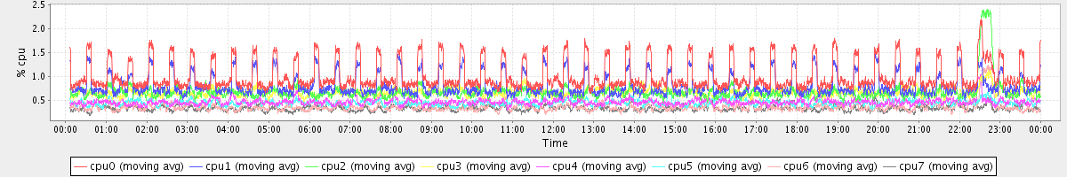 avg(cpu0) = 1.01 avg(cpu1) = 0.82 avg(cpu2) = 0.68 avg(cpu3) = 0.66 avg(cpu4) = 0.46 avg(cpu5) = 0.45 avg(cpu6) = 0.36 avg(cpu7) = 0.33