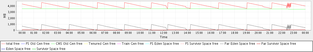 avg(total free) = 4119.26 avg(PS Old Gen free) = 0.00 avg(CMS Old Gen free) = 3545.03 avg(Tenured Gen free) = 0.00 avg(Train Gen free) = 0.00 avg(PS Eden Space free) = 0.00 avg(PS Survivor Space free) = 0.00 avg(Par Eden Space free) = 505.13 avg(Par Survivor Space free) = 69.09 avg(Eden Space free) = 0.00 avg(Survivor Space free) = 0.00