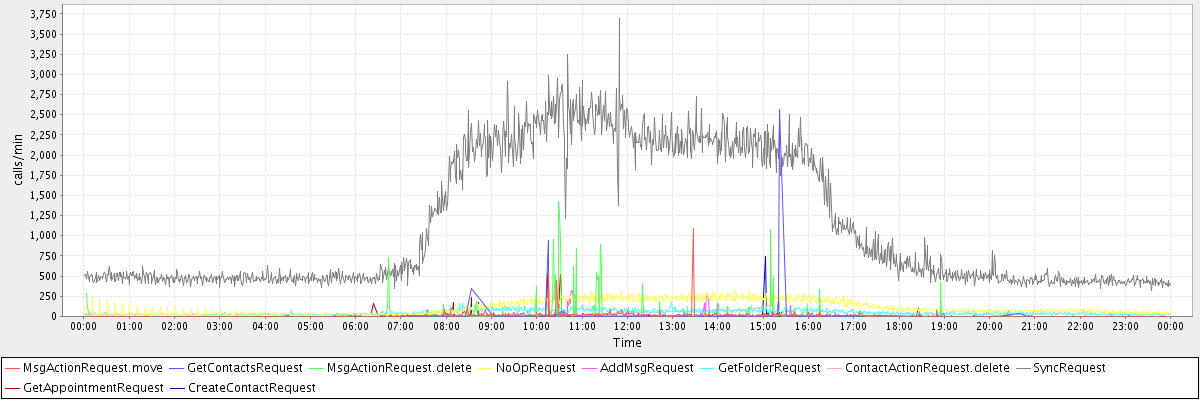 max(MsgActionRequest.move) = 1089.00 max(GetContactsRequest) = 2560.00 max(MsgActionRequest.delete) = 1424.00 max(NoOpRequest) = 338.00 max(AddMsgRequest) = 318.00 max(GetFolderRequest) = 179.00 max(ContactActionRequest.delete) = 514.00 max(SyncRequest) = 3689.00 max(GetAppointmentRequest) = 536.00 max(CreateContactRequest) = 740.00