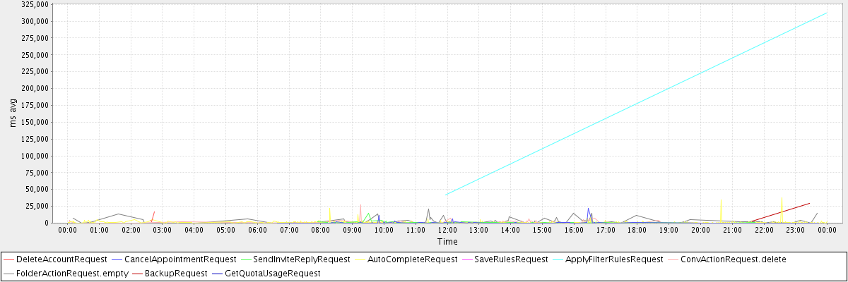 avg(DeleteAccountRequest) = 7525.00 avg(CancelAppointmentRequest) = 700.41 avg(SendInviteReplyRequest) = 1016.83 avg(AutoCompleteRequest) = 976.57 avg(SaveRulesRequest) = 2549.00 avg(ApplyFilterRulesRequest) = 177003.50 avg(ConvActionRequest.delete) = 1731.30 avg(FolderActionRequest.empty) = 3090.12 avg(BackupRequest) = 14998.50 avg(GetQuotaUsageRequest) = 2485.00