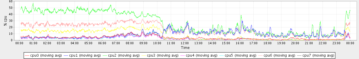 avg(cpu0) = 3.97 avg(cpu1) = 9.04 avg(cpu2) = 26.58 avg(cpu3) = 7.97 avg(cpu4) = 2.55 avg(cpu5) = 2.76 avg(cpu6) = 17.12 avg(cpu7) = 3.23