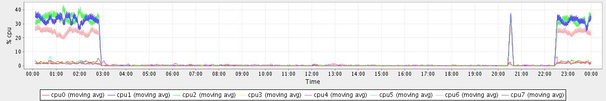 avg(cpu0) = 1.09 avg(cpu1) = 1.17 avg(cpu2) = 0.95 avg(cpu3) = 0.69 avg(cpu4) = 0.52 avg(cpu5) = 0.46 avg(cpu6) = 0.52 avg(cpu7) = 0.36