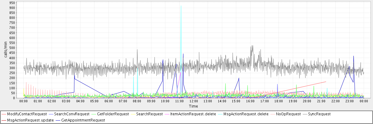 max(ModifyContactRequest) = 165.00 max(SearchConvRequest) = 140.00 max(GetFolderRequest) = 145.00 max(SearchRequest) = 96.00 max(ItemActionRequest.delete) = 260.00 max(MsgActionRequest.delete) = 919.00 max(NoOpRequest) = 156.00 max(SyncRequest) = 526.00 max(MsgActionRequest.update) = 60.00 max(GetAppointmentRequest) = 441.00