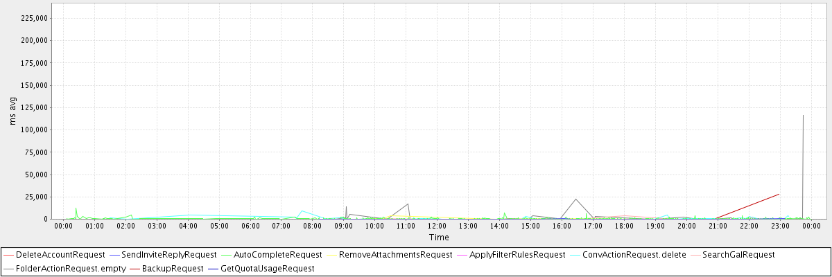 avg(DeleteAccountRequest) = 7810.00 avg(SendInviteReplyRequest) = 294.45 avg(AutoCompleteRequest) = 531.57 avg(RemoveAttachmentsRequest) = 605.60 avg(ApplyFilterRulesRequest) = 230922.00 avg(ConvActionRequest.delete) = 645.24 avg(SearchGalRequest) = 508.50 avg(FolderActionRequest.empty) = 5043.37 avg(BackupRequest) = 14173.50 avg(GetQuotaUsageRequest) = 1205.00