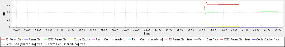 avg(PS Perm Gen) = 0.00 avg(Perm Gen) = 0.00 avg(CMS Perm Gen) = 67.00 avg(Code Cache) = 17.20 avg(Perm Gen [shared-ro]) = 0.00 avg(Perm Gen [shared-rw]) = 0.00 avg(PS Perm Gen free) = 0.00 avg(Perm Gen free) = 0.00 avg(CMS Perm Gen free) = 61.00 avg(Code Cache free) = 0.32 avg(Perm Gen [shared-ro] free) = 0.00 avg(Perm Gen [shared-rw] free) = 0.00