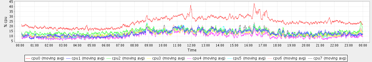 avg(cpu0) = 24.23 avg(cpu1) = 12.61 avg(cpu2) = 14.29 avg(cpu3) = 12.17 avg(cpu4) = 10.17 avg(cpu5) = 12.52 avg(cpu6) = 12.87 avg(cpu7) = 12.65