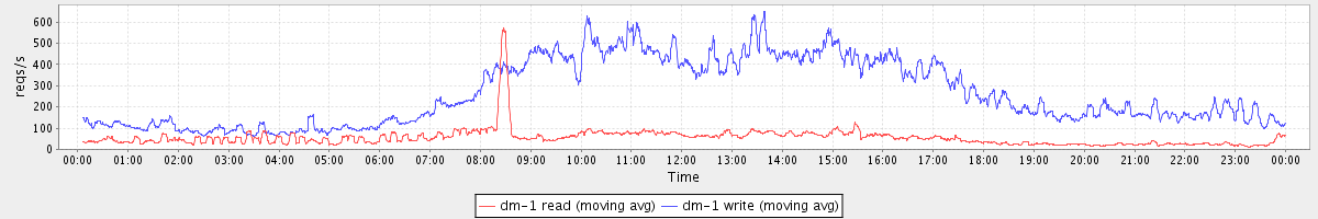 avg(dm-1 read) = 643.74 avg(dm-1 write) = 1455.75