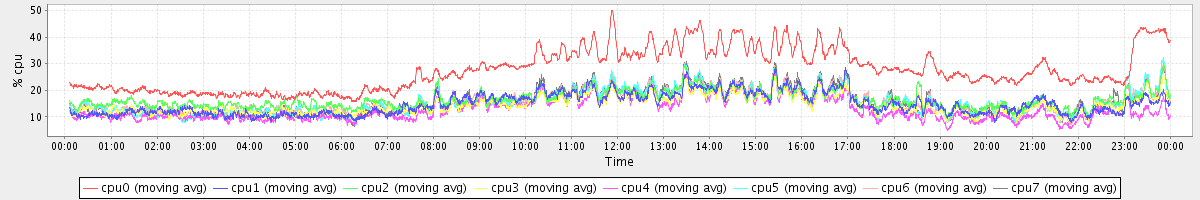 avg(cpu0) = 27.61 avg(cpu1) = 14.92 avg(cpu2) = 16.60 avg(cpu3) = 14.46 avg(cpu4) = 12.85 avg(cpu5) = 15.46 avg(cpu6) = 15.62 avg(cpu7) = 15.75