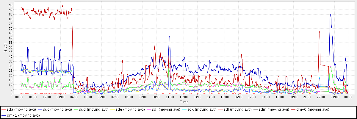 avg(sda) = 0.40 avg(sdc) = 7.03 avg(sdd) = 7.59 avg(sde) = 7.04 avg(sdj) = 7.60 avg(sdk) = 7.02 avg(sdl) = 7.63 avg(sdm) = 7.11 avg(dm-0) = 25.47 avg(dm-1) = 22.00