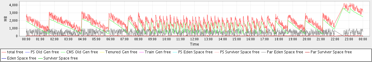 avg(total free) = 1801.68 avg(PS Old Gen free) = 0.00 avg(CMS Old Gen free) = 1286.69 avg(Tenured Gen free) = 0.00 avg(Train Gen free) = 0.00 avg(PS Eden Space free) = 0.00 avg(PS Survivor Space free) = 0.00 avg(Par Eden Space free) = 484.84 avg(Par Survivor Space free) = 30.16 avg(Eden Space free) = 0.00 avg(Survivor Space free) = 0.00
