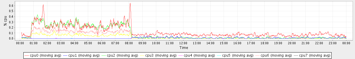 avg(cpu0) = 1.73 avg(cpu1) = 0.20 avg(cpu2) = 0.30 avg(cpu3) = 0.19 avg(cpu4) = 0.15 avg(cpu5) = 0.13 avg(cpu6) = 0.22 avg(cpu7) = 0.15