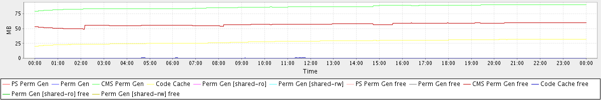 avg(PS Perm Gen) = 0.00 avg(Perm Gen) = 0.00 avg(CMS Perm Gen) = 86.77 avg(Code Cache) = 28.13 avg(Perm Gen [shared-ro]) = 0.00 avg(Perm Gen [shared-rw]) = 0.00 avg(PS Perm Gen free) = 0.00 avg(Perm Gen free) = 0.00 avg(CMS Perm Gen free) = 57.09 avg(Code Cache free) = 0.26 avg(Perm Gen [shared-ro] free) = 0.00 avg(Perm Gen [shared-rw] free) = 0.00