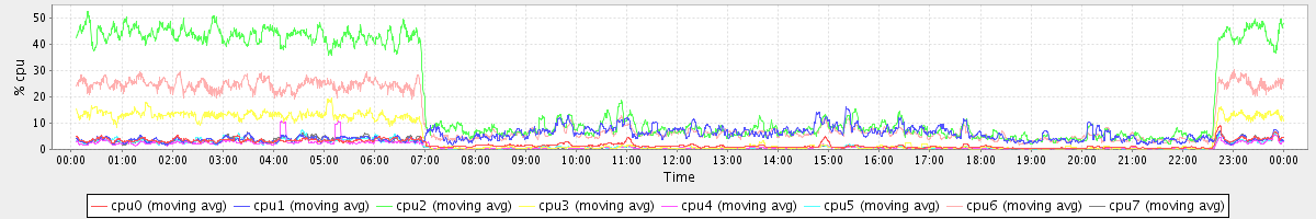 avg(cpu0) = 1.99 avg(cpu1) = 5.34 avg(cpu2) = 19.61 avg(cpu3) = 4.95 avg(cpu4) = 1.27 avg(cpu5) = 1.47 avg(cpu6) = 12.14 avg(cpu7) = 1.57