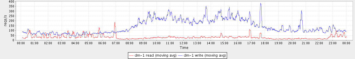 avg(dm-1 read) = 31.94 avg(dm-1 write) = 141.47