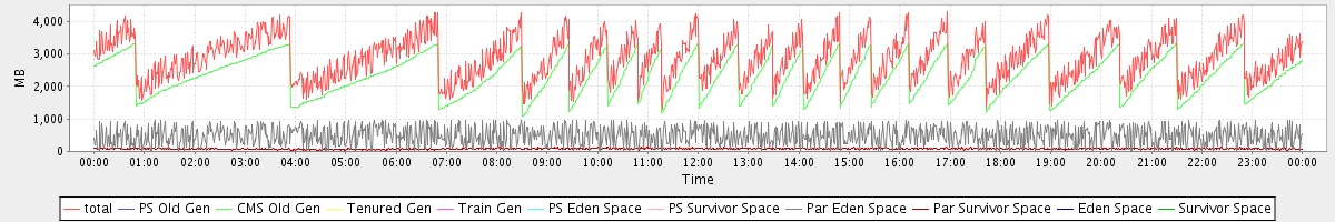 avg(total) = 2876.97 avg(PS Old Gen) = 0.00 avg(CMS Old Gen) = 2308.54 avg(Tenured Gen) = 0.00 avg(Train Gen) = 0.00 avg(PS Eden Space) = 0.00 avg(PS Survivor Space) = 0.00 avg(Par Eden Space) = 486.05 avg(Par Survivor Space) = 82.38 avg(Eden Space) = 0.00 avg(Survivor Space) = 0.00