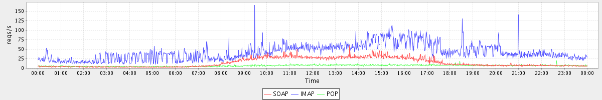 Host zm03.stanford.edu: Mailboxd: Request Rate by Client Protocol