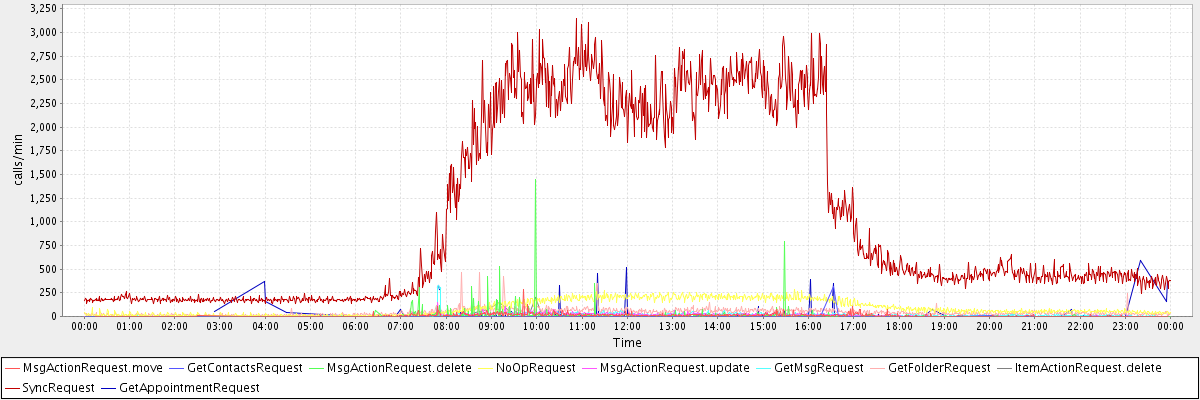 max(MsgActionRequest.move) = 285.00 max(GetContactsRequest) = 312.00 max(MsgActionRequest.delete) = 1450.00 max(NoOpRequest) = 281.00 max(MsgActionRequest.update) = 152.00 max(GetMsgRequest) = 332.00 max(GetFolderRequest) = 466.00 max(ItemActionRequest.delete) = 196.00 max(SyncRequest) = 3142.00 max(GetAppointmentRequest) = 594.00