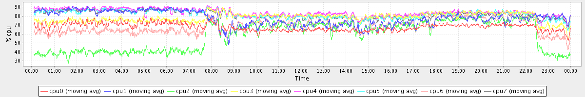 avg(cpu0) = 67.80 avg(cpu1) = 77.38 avg(cpu2) = 58.31 avg(cpu3) = 78.46 avg(cpu4) = 84.05 avg(cpu5) = 81.89 avg(cpu6) = 68.55 avg(cpu7) = 81.75