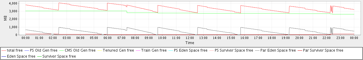 avg(total free) = 3381.39 avg(PS Old Gen free) = 0.00 avg(CMS Old Gen free) = 2826.06 avg(Tenured Gen free) = 0.00 avg(Train Gen free) = 0.00 avg(PS Eden Space free) = 0.00 avg(PS Survivor Space free) = 0.00 avg(Par Eden Space free) = 506.40 avg(Par Survivor Space free) = 48.93 avg(Eden Space free) = 0.00 avg(Survivor Space free) = 0.00