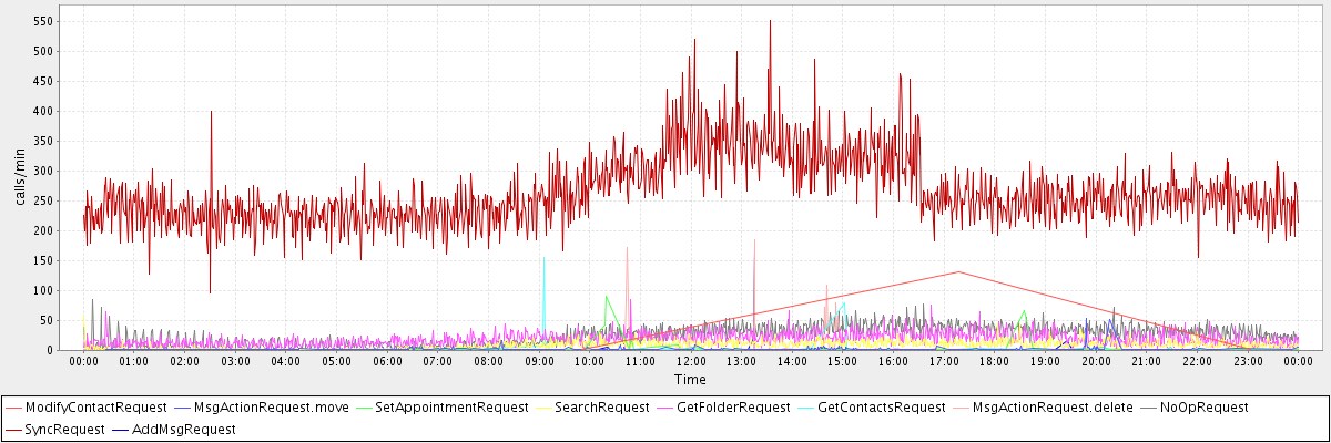 max(ModifyContactRequest) = 132.00 max(MsgActionRequest.move) = 53.00 max(SetAppointmentRequest) = 91.00 max(SearchRequest) = 57.00 max(GetFolderRequest) = 85.00 max(GetContactsRequest) = 156.00 max(MsgActionRequest.delete) = 185.00 max(NoOpRequest) = 85.00 max(SyncRequest) = 551.00 max(AddMsgRequest) = 164.00