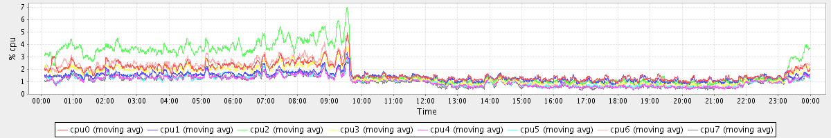 avg(cpu0) = 3.21 avg(cpu1) = 4.94 avg(cpu2) = 21.14 avg(cpu3) = 6.26 avg(cpu4) = 1.91 avg(cpu5) = 1.98 avg(cpu6) = 12.13 avg(cpu7) = 2.30