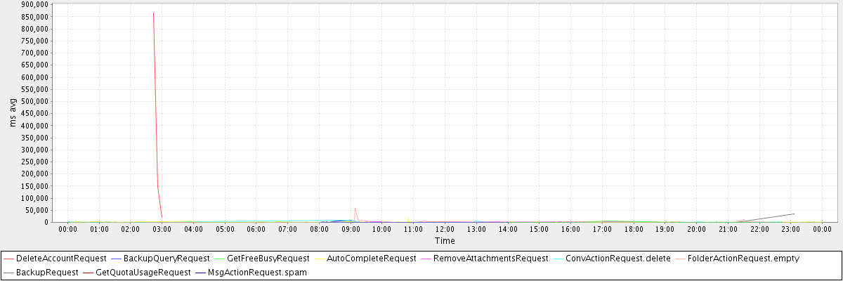 avg(DeleteAccountRequest) = 344664.33 avg(BackupQueryRequest) = 726.25 avg(GetFreeBusyRequest) = 910.20 avg(AutoCompleteRequest) = 750.04 avg(RemoveAttachmentsRequest) = 803.20 avg(ConvActionRequest.delete) = 722.28 avg(FolderActionRequest.empty) = 2586.89 avg(BackupRequest) = 17179.50 avg(GetQuotaUsageRequest) = 1237.00 avg(MsgActionRequest.spam) = 675.36