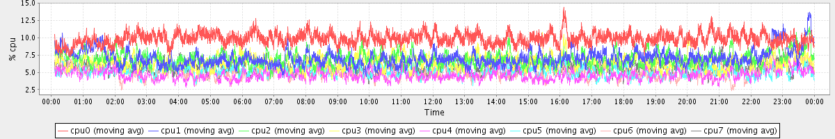 avg(cpu0) = 9.83 avg(cpu1) = 7.06 avg(cpu2) = 6.95 avg(cpu3) = 6.46 avg(cpu4) = 4.66 avg(cpu5) = 5.30 avg(cpu6) = 5.06 avg(cpu7) = 5.67