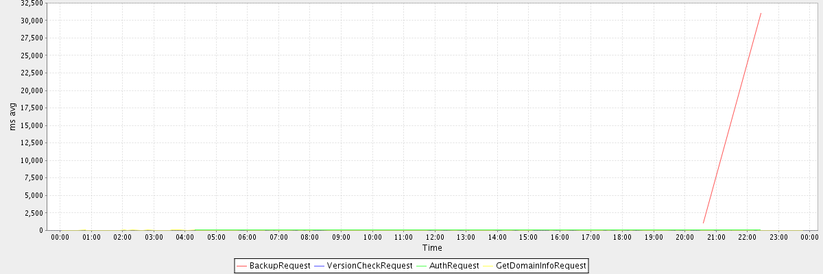 avg(BackupRequest) = 16017.50 avg(VersionCheckRequest) = 624.00 avg(AuthRequest) = 45.33 avg(GetDomainInfoRequest) = 7.27