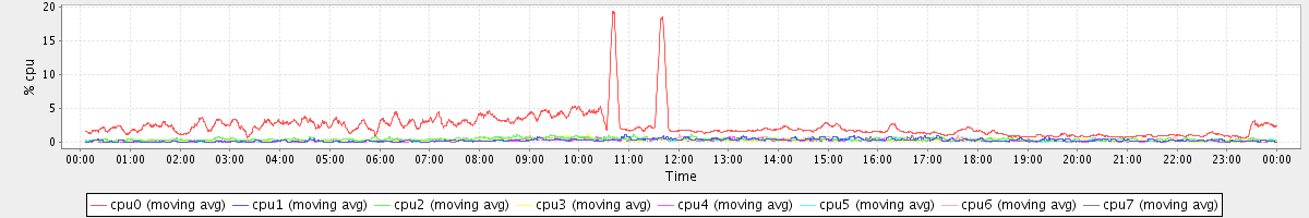 avg(cpu0) = 2.30 avg(cpu1) = 0.27 avg(cpu2) = 0.40 avg(cpu3) = 0.25 avg(cpu4) = 0.18 avg(cpu5) = 0.18 avg(cpu6) = 0.29 avg(cpu7) = 0.19