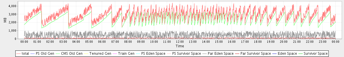 avg(total) = 2967.18 avg(PS Old Gen) = 0.00 avg(CMS Old Gen) = 2391.11 avg(Tenured Gen) = 0.00 avg(Train Gen) = 0.00 avg(PS Eden Space) = 0.00 avg(PS Survivor Space) = 0.00 avg(Par Eden Space) = 484.91 avg(Par Survivor Space) = 91.15 avg(Eden Space) = 0.00 avg(Survivor Space) = 0.00