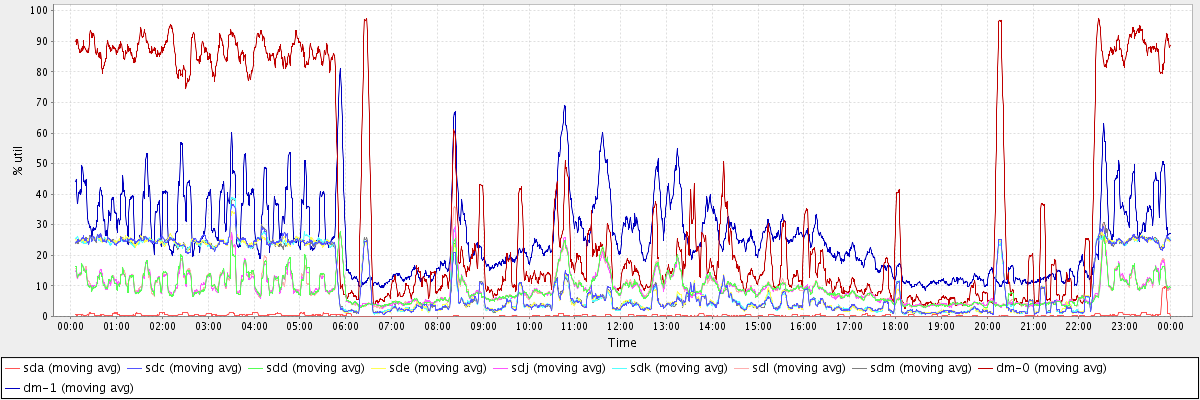 avg(sda) = 0.38 avg(sdc) = 10.77 avg(sdd) = 8.97 avg(sde) = 10.72 avg(sdj) = 8.98 avg(sdk) = 10.74 avg(sdl) = 9.04 avg(sdm) = 10.76 avg(dm-0) = 38.31 avg(dm-1) = 25.85