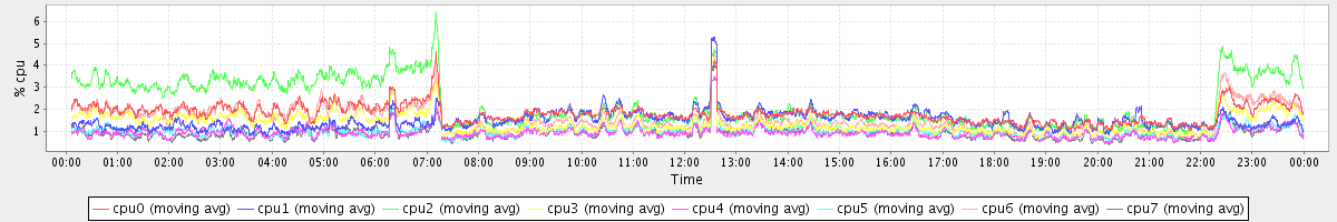 avg(cpu0) = 1.87 avg(cpu1) = 0.22 avg(cpu2) = 0.34 avg(cpu3) = 0.19 avg(cpu4) = 0.12 avg(cpu5) = 0.14 avg(cpu6) = 0.23 avg(cpu7) = 0.14