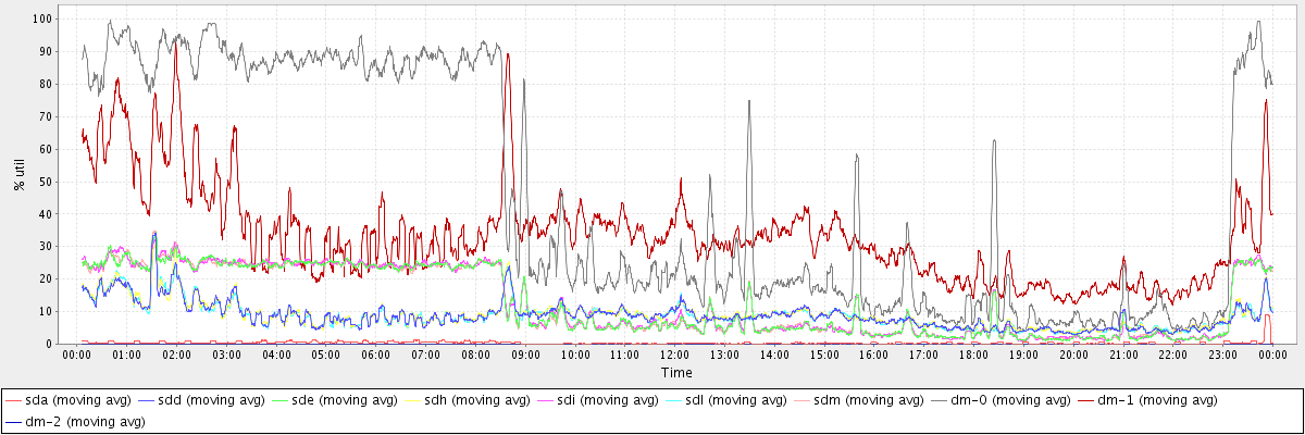 avg(sda) = 0.43 avg(sdd) = 8.77 avg(sde) = 12.58 avg(sdh) = 8.87 avg(sdi) = 12.71 avg(sdl) = 8.71 avg(sdm) = 12.62 avg(dm-0) = 44.97 avg(dm-1) = 33.24 avg(dm-2) = 0.00