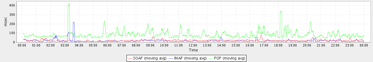 avg(DeleteAccountRequest) = 86793.00 avg(BackupQueryRequest) = 868.25 avg(CreateAppointmentExceptionRequest) = 674.87 avg(CancelAppointmentRequest) = 1402.23 avg(SendInviteReplyRequest) = 939.95 avg(AutoCompleteRequest) = 995.53 avg(ConvActionRequest.delete) = 1023.33 avg(FolderActionRequest.empty) = 4499.21 avg(BackupRequest) = 15080.00 avg(GetQuotaUsageRequest) = 1193.00