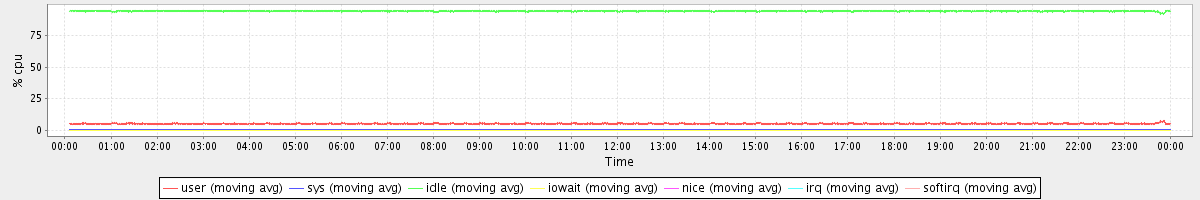 avg(user) = 5.27 avg(sys) = 0.44 avg(idle) = 94.24 avg(iowait) = 0.03 avg(nice) = 0.00 avg(irq) = 0.00 avg(softirq) = 0.00