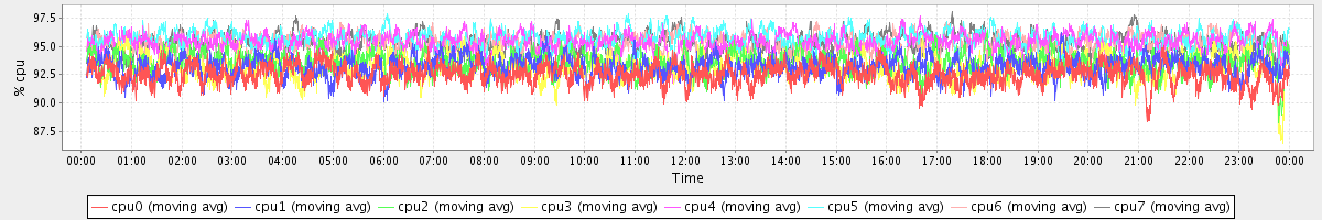 avg(cpu0) = 92.53 avg(cpu1) = 93.17 avg(cpu2) = 93.56 avg(cpu3) = 93.18 avg(cpu4) = 95.37 avg(cpu5) = 95.67 avg(cpu6) = 95.20 avg(cpu7) = 95.25