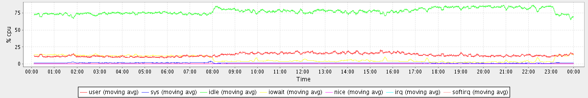 avg(user) = 13.17 avg(sys) = 1.40 avg(idle) = 77.86 avg(iowait) = 7.09 avg(nice) = 0.00 avg(irq) = 0.05 avg(softirq) = 0.43