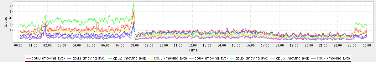 avg(cpu0) = 2.06 avg(cpu1) = 0.23 avg(cpu2) = 0.33 avg(cpu3) = 0.19 avg(cpu4) = 0.12 avg(cpu5) = 0.15 avg(cpu6) = 0.22 avg(cpu7) = 0.13