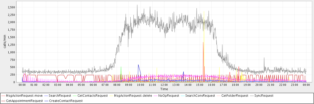 max(MsgActionRequest.move) = 1333.00 max(SearchRequest) = 174.00 max(GetContactsRequest) = 517.00 max(MsgActionRequest.delete) = 2364.00 max(NoOpRequest) = 307.00 max(SearchConvRequest) = 113.00 max(GetFolderRequest) = 188.00 max(SyncRequest) = 2579.00 max(GetAppointmentRequest) = 287.00 max(CreateContactRequest) = 592.00