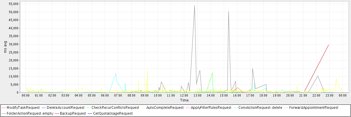 avg(ModifyTaskRequest) = 625.33 avg(DeleteAccountRequest) = 2299.00 avg(CheckRecurConflictsRequest) = 686.38 avg(AutoCompleteRequest) = 684.03 avg(ApplyFilterRulesRequest) = 12143.00 avg(ConvActionRequest.delete) = 720.97 avg(ForwardAppointmentRequest) = 2028.00 avg(FolderActionRequest.empty) = 3467.85 avg(BackupRequest) = 15021.00 avg(GetQuotaUsageRequest) = 1348.00