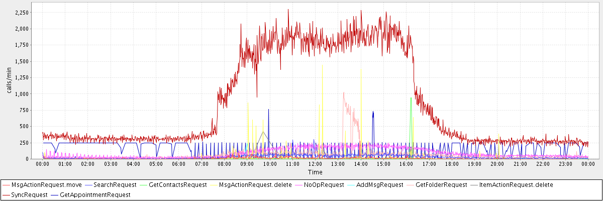 max(MsgActionRequest.move) = 280.00 max(SearchRequest) = 298.00 max(GetContactsRequest) = 945.00 max(MsgActionRequest.delete) = 1443.00 max(NoOpRequest) = 256.00 max(AddMsgRequest) = 242.00 max(GetFolderRequest) = 1029.00 max(ItemActionRequest.delete) = 424.00 max(SyncRequest) = 2297.00 max(GetAppointmentRequest) = 762.00