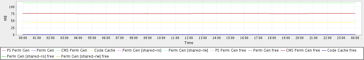 avg(PS Perm Gen) = 0.00 avg(Perm Gen) = 0.00 avg(CMS Perm Gen) = 114.46 avg(Code Cache) = 45.29 avg(Perm Gen [shared-ro]) = 0.00 avg(Perm Gen [shared-rw]) = 0.00 avg(PS Perm Gen free) = 0.00 avg(Perm Gen free) = 0.00 avg(CMS Perm Gen free) = 76.43 avg(Code Cache free) = 2.53 avg(Perm Gen [shared-ro] free) = 0.00 avg(Perm Gen [shared-rw] free) = 0.00