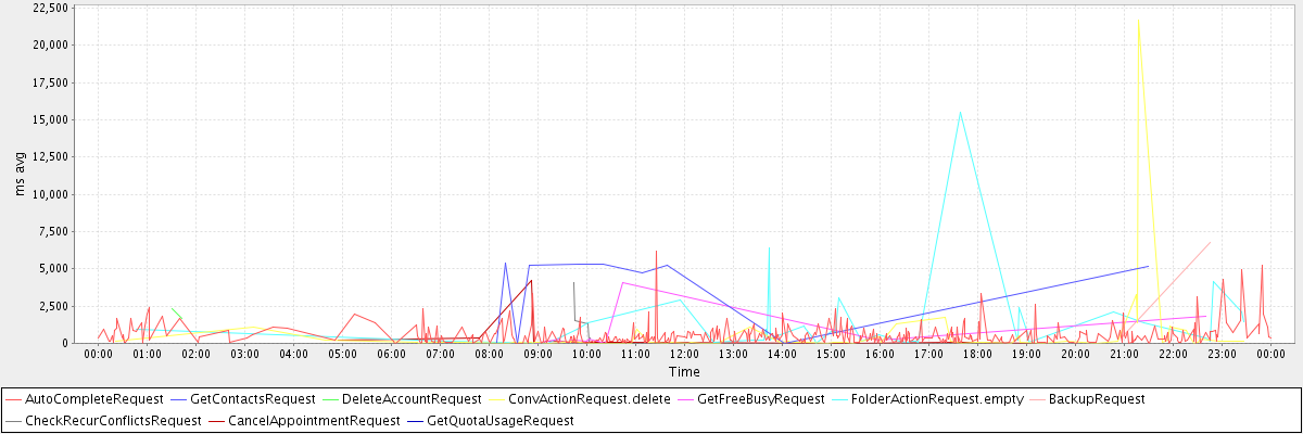 avg(AutoCompleteRequest) = 522.75 avg(GetContactsRequest) = 1513.75 avg(DeleteAccountRequest) = 2000.00 avg(ConvActionRequest.delete) = 503.21 avg(GetFreeBusyRequest) = 541.50 avg(FolderActionRequest.empty) = 1388.60 avg(BackupRequest) = 3570.50 avg(CheckRecurConflictsRequest) = 1244.00 avg(CancelAppointmentRequest) = 410.31 avg(GetQuotaUsageRequest) = 1244.00
