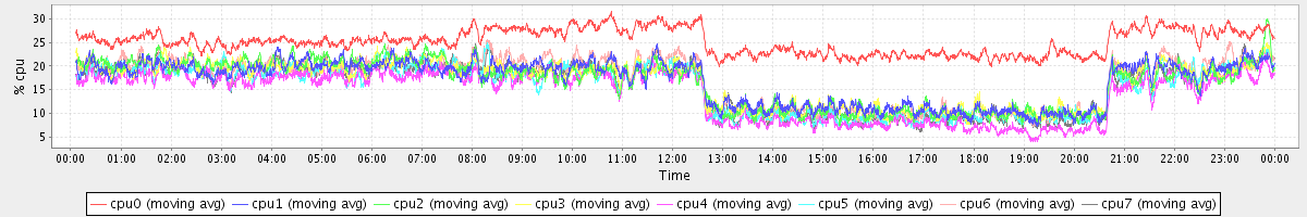 avg(cpu0) = 25.18 avg(cpu1) = 16.77 avg(cpu2) = 16.59 avg(cpu3) = 16.63 avg(cpu4) = 14.25 avg(cpu5) = 15.71 avg(cpu6) = 17.10 avg(cpu7) = 16.01