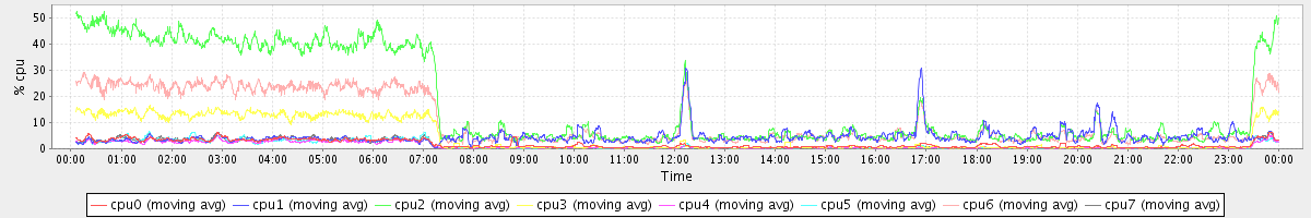 avg(cpu0) = 1.73 avg(cpu1) = 4.50 avg(cpu2) = 17.26 avg(cpu3) = 4.63 avg(cpu4) = 1.09 avg(cpu5) = 1.31 avg(cpu6) = 10.78 avg(cpu7) = 1.37