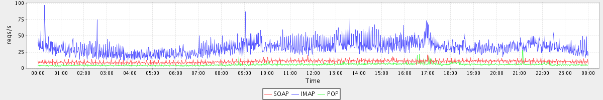 Host zm08.stanford.edu: Mailboxd: Request Rate by Client Protocol
